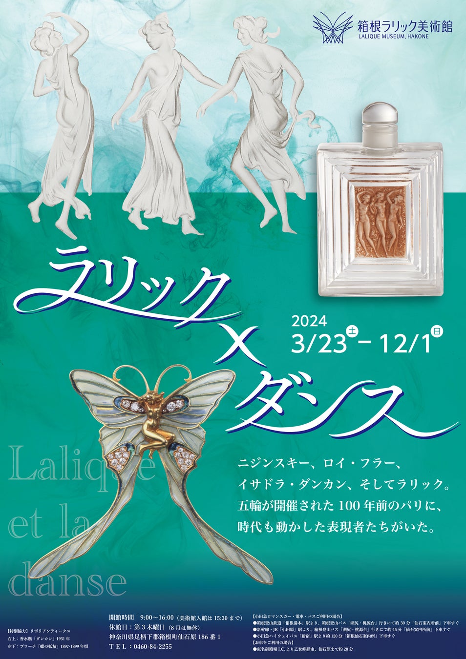 『ラリック✕ダンス』企画展では、100年前のパリ五輪と共に、装飾芸術家ルネ・ラリックの時代を振り返ります。1900年、パリ万国博覧会の附属大会としてパリは初めて五輪会場となり、1924年には二度目の五輪が開かれ、パリはスポーツと芸術の中心地としてその地位を確立しました。まさに時代の寵児であった装飾芸術家ルネ・ラリックは、パリ万博でのグランプリ受賞をはじめ、1925 年の現代装飾美術産業美術国際博覧会(通称アール・デコ博覧会)ではガラス部門の統括責任者を務めるなど、芸術界で独創的な足跡を残しました。また、時を同じくしてモダン・ダンスの祖とされるロイ・フラーとイサドラ・ダンカンが、それぞれ独自のスタイルで新風を吹き込み、ダンスの世界は大きな革命を迎えることになります。彼らの芸術は、モダニズムの流れを汲む多くの作家たちに多大なインスピレーションを与えました。ラリック自身も、幼少期から培った観察眼とデッサン力を生かし、舞台上で華麗に舞い踊るダンサーの姿を独自に解釈し、造形化することで、その美しさとエネルギーを視覚芸術に昇華させました。この企画展では、ラリックが表現したダンスの世界を、時代の躍動感と共にお楽しみいただけます。
