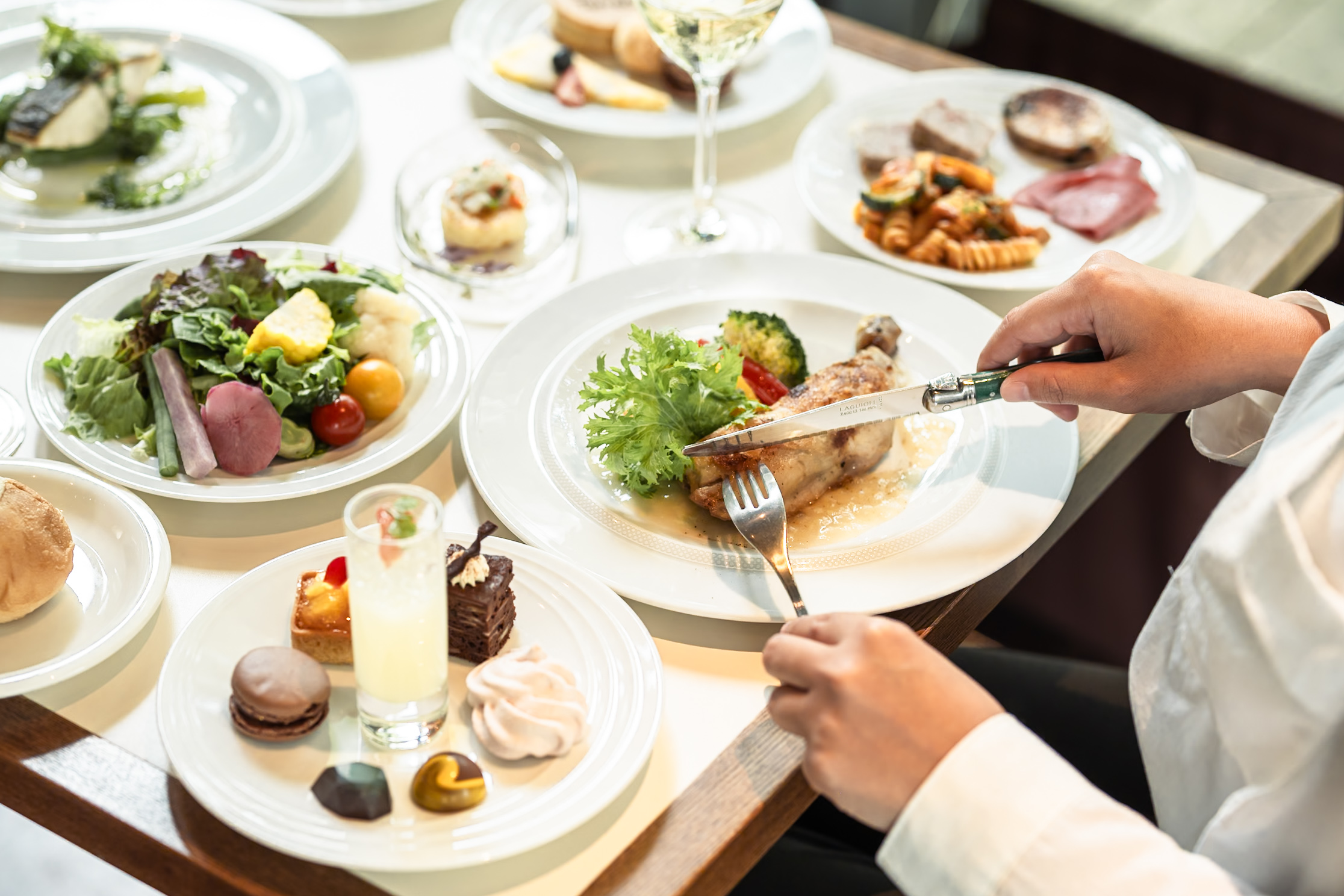 セットのランチでは、肉または魚からお選びいただけるメイン料理に加え、フリードリンクもご用意。スイーツとともに、贅沢なひとときをお過ごしいただけます。
